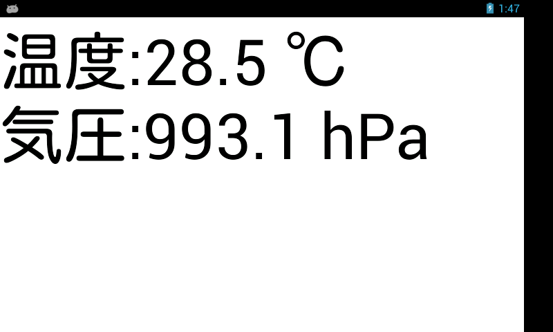 | i2c-dev.h これは何も変更を加えてないヘッダーファイルです。 my_i2c_sensors.h int openI2C(char* deviceName); I2Cデバイスをオープンする関数です。 int activateLPS331AP(int fd); 電源投入時は、センサーはスリープになっています。これを起こしてやるための関数です。 float getTempareture(int fd); センサーから温度データを取得する関数です。 float getPressure(int fd); センサーから大気圧データを取得する関数です。 my_i2c_sensors.c 上記以外の関数の説明: int SetSmbus (int fd, char rw, int command, int size, union i2c_smbus_data *data) SMbusにデータをセットする関数です。 static u_char readSensor(int fd, int sensorAddr, u_char regNo) センサーからデータを読み出す関数です。 sensorAddr:センサーのアドレスを指定します。LPS331APは0x5dです。 regNo:読み出すレジスタ番号を指定します。 static int writeSensor(int fd, int sensorAddr, u_char regNo, u_char data) センサーにデータを書き込む関数です。 sensorAddr:センサーのアドレスを指定します。LPS331APは0x5dです。 regNo:書き込むレジスタ番号を指定します。 data:書き込むデータ my_sensors.c これがセンサーでのデータ取得とAndroidアプリにデータを渡すインターフェースになります。 Android Appプログラムではセンサーがあるか?リストを取得します。 //センサーマネージャの取得(1) sensorManager=(SensorManager)getSystemService( Context.SENSOR_SERVICE); //センサーの取得(2) List<Sensor> list; list=sensorManager.getSensorList(Sensor.TYPE_TEMPERATURE); if (list.size()>0) tempmeter=list.get(0); list=sensorManager.getSensorList(Sensor.TYPE_PRESSURE); if (list.size()>0) pressmeter=list.get(0); このリストを定義しているのが、g_SensorList[]です。