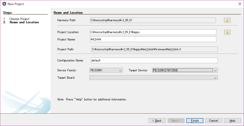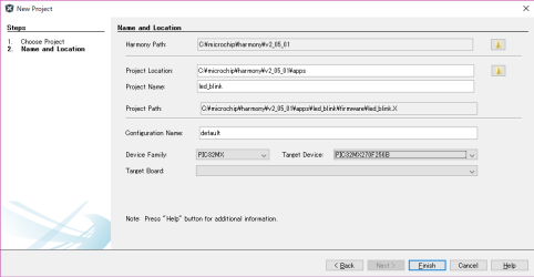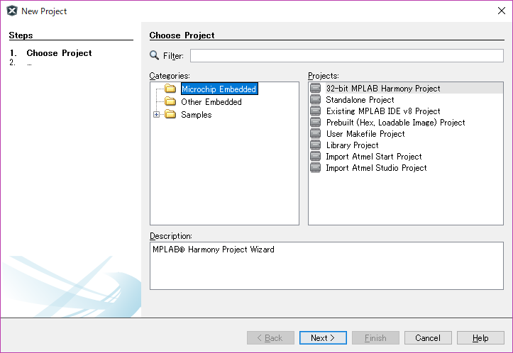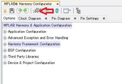 先ずはプロジェクトを作成します。 [File]-[New Project...] をクリックします。 ![]() 32-bit MPLAB Harmony Project を選び[Next]ボタンをクリックします。 ![]() プロジェクト名 led_blink Target Device お使いのPIC を入力します。 [Finish]ボタンをクリックします。 Harmony Configratorの画面が表示されます。 ![]() 何も設定しないで赤の矢印で示したボタンをクリックします。 ![]() |