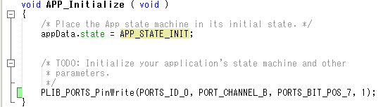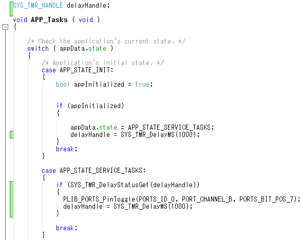 やることは、 「タイマーによってLEDのON・OFFをする」 といたって簡単です。 ポートを制御する関数は、 PLIB_PORTS_PinWrite(PORTS_ID_0, PORT_CHANNEL_B, PORTS_BIT_POS_7, 0); 最後のパラメータがON/OFFをする。 PLIB_PORTS_PinToggle(PORTS_ID_0, PORT_CHANNEL_B, PORTS_BIT_POS_7); これは便利な関数でポートを反転させてくれる。 最初は、イニシャルでLEDを点灯させる。 ![]() 追加したところに緑の四角が表示されています。 デバッグしてみます。 コンパイルは成功。 Run状態になるとLEDが点灯します。今はこれだけ。 タイマーはダイマードライバーを使う方法: タイマー割り込みのイベントハンドラーを実装して行うPICでよくあるやり方 システムサービスでタイマーを監視するやり方: があります。今回はLEDを周期的にON/OFFするだけなので正確性を確保する必要がないので システムサービスをつかうことにします。 追加するソースは次のようになります。 ![]() SYS_TMR_HANDLE delayHandle; でタイマーのハンドラーを割り当てます。 次に delayHandle = SYS_TMR_DelayMS(1000); で1000msecのタイマー値をセットします。 if (SYS_TMR_DelayStatusGet(delayHandle)) で1000msec経過するとtrueになります。 PLIB_PORTS_PinToggle(PORTS_ID_0, PORT_CHANNEL_B, PORTS_BIT_POS_7); でRB7の出力値を反転させます。 そしてタイマーを再セットします。 これでLチカが完成です。 |