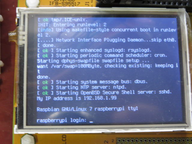 | うまくいきました。 前回の不具合は起きませんでした。 こんな風に完成です。 ![]() 秋月さんで買ったCPUファンを付けています。気温の高いときにフリーズすることが激減しました。また、液晶の表示は自作のテストプログラムです。思ったように表示しています。 Raspberry Piの立ち上がり画面です。 ![]() 小さいですが、コンピュータです。 |