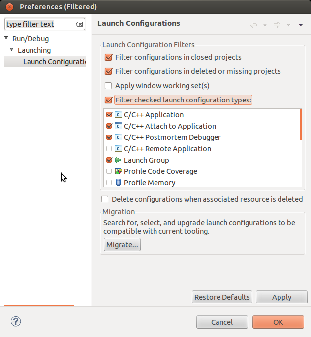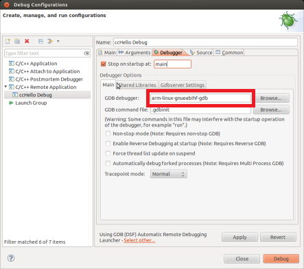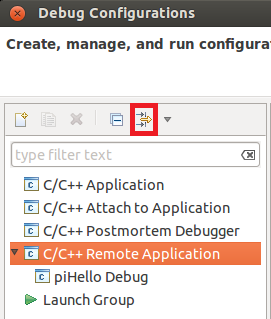 | デバッグを始めるのにいちいち [Run]-[Debug Configuratons ...] からやるのでは面倒です。 F11キーを押したら、リモートデバッグできないか? できます! [Run]-[Debug Configuratons ...]をクリックします。 ![]() この設定では、[F11]キーを押すと、 C/C++Application で動作します。つまりリモートではなく母艦側のLinuxでarmのアプリを動かすことになるのでダメだと怒られます。 要するにC/C++ Remote Application以外は邪魔です。 この邪魔物を排除するために、赤で示した[Filter launch configuaratons...]をクリックします。 ![]() C/C++ Remote Application以外は使わないという設定になります。 このように設定して[OK]ボタンをクリックします。 ![]() C/C++ Remote Applicationだけになりました。 こうすることで、[F11]キーを押すとC/C++ Remote Applicationでデバッグできます。 |