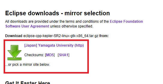 | 下記のURLよりEclipseをダウンロードします。 https://www.eclipse.org/downloads/packages/eclipse-ide-cc-developers/keplersr2 ![]() Linux 64-bitを選びます。 ![]() ダウンロードします。 Eclipseの解凍 cd ~ tar -xvzf eclipse-cpp-kepler-SR2-linux-gtk-x86_64.tar.gz eclipseのフォルダーができています。 Eclipseは日本語化ができます。しかし、日本語化はしないほうがいいです。RaspberryやBeagle Bone Blackなどの情報は圧倒的に英語です。日本語化すると逆に不便になります。 |