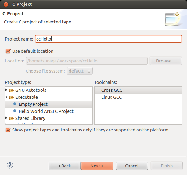 [File]-[New]-[Project]をクリックします。![]() CProjectを選びます。 [Next]ボタンをクリックします。 Project Nameを入力します。 ![]() ここで大事なこと! Raspberry Piのプロジェクトの場合はCrossGCCを選びます。これでarm対応の実行ファイルが作成されます。 [Next]ボタンをクリックします。 ![]() [Next]ボタンをクリックします。 ![]() Cross Compiler Prefix:は arm-linux-gnueabihf- です。 Cross Compiler Path:は /home/user/rpi/tools/arm-bcm2708/gcc-linaro-arm-linux-gnueabihf-raspbian-x64/bin/ です。 /home/user/rpi のところは自分で設定したフォルダーを適用してください。 最後に[Finish]ボタンをクリックしてください。 |