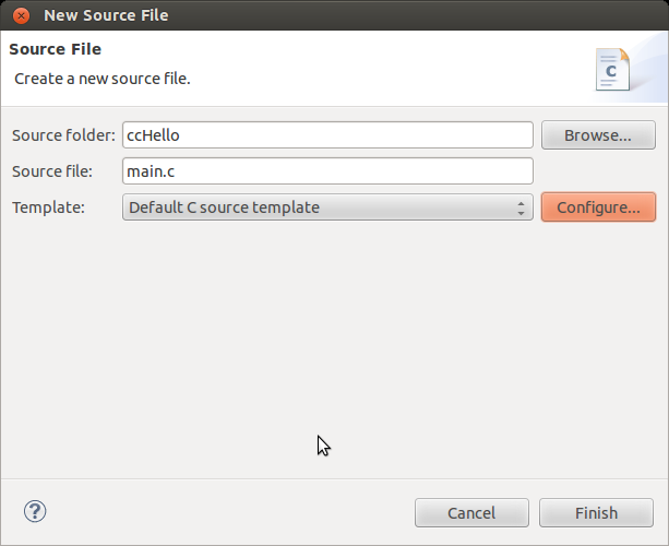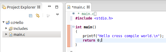 | いよいよプログラムを作成します。 [File]-[New]-[Source File]をクリックします。 ![]() [Finish]ボタンをクリックします。 main.cの画面が現れます。 以下のように記述します。 ![]() [File]-[Save]をクリックします。 [Project]-[Build All]をクリックします。 ![]() これで実行ファイルができました。 もちろんarmでコンパイルしたのでUbuntu上では動かない実行ファイルです。 cd ~/workspace/ccHello/Debug ls で見ると確かに実行ファイルccHelloがあります。 ./ccHello 実行できませんと起こられます。 当たり前のことが確認できました。 これをRaspberry Piに転送して確認します。 sftp pi@192.168.1.99 アドレスは必要に応じて書き換えてください。パスワード raspberry で接続します。 put ccHello でRaspberry Piに送ります。 exit でsftpを終了します。 次は、 ssh pi@192.168.1.99 パスワード raspberry で接続します。 ./ccHello Hello cross compiler world. 実行できました。 しかし、これってとても面倒です。 これを解決するのがリモートシステムです。 |