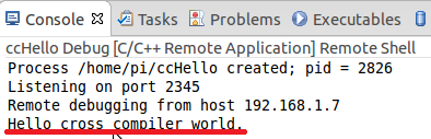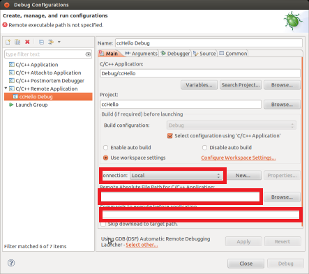 | ここまでできるようになると、更に欲が出てきます。 自動でRaspberry Piに転送できるようにしたい デバッグもできるようにしたい 調べた結果できます。 [Run]-[Debug Configrations...]をクリックします。 ![]() C/C++ Remote Applicationを選択して、左上の新規ボタンをクリックします。 ![]() 変更するのは赤で示した次の箇所です。 Connetction: Raspberry Pi にします。 ![]() これはccHello をRaspberry Piに転送するためのパスと実行ファイル名の設定です。 Raspberry Piのホームディレクトリ直下に転送するようにしていますが、任意のフォルダーに設定してもOKです。 これは転送したccHelloに実行権限を与える設定です。 次にDebugタブの変更をします。 ![]() GDB debugger: arm-linux-gnueabihf-gdb にします。 [Apply]ボタンをクリックします。 [Debug]ボタンをクリックします。 パスワードのダイアログがでるときは、raspberryを入力します。 ![]() [OK]ボタンをクリックします。 ![]() [Yes]ボタンをクリックします。 オーーーーーーーーーーーーーーーーーー! デバッグ画面になりました。 ![]() この状態ではブレークしています。 [Run]-[Step Over]をクリックする(またはF6キーを押す)と1行づつ実行します。 実行結果はConsoleで確認できます。 ![]() やっとデバッグもできるようになったぞ!!!!!! |