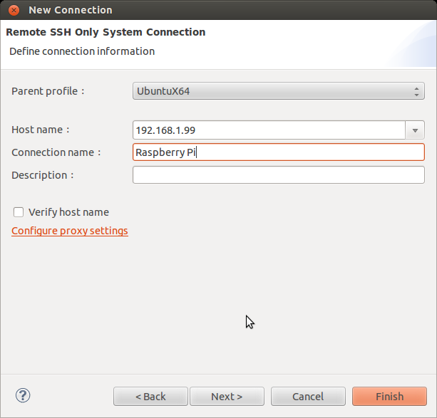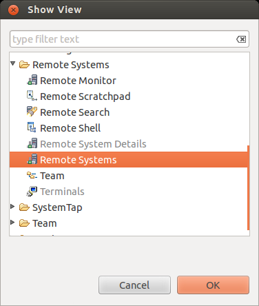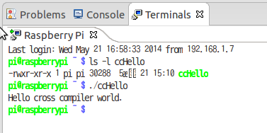 | sftpとsshを使って作成した実行ファイルが動作することを確認しました。リモートシステムを使うとsftpとsshと同等の機能ををEclipseから使うことができます。 [Window]-[Show View]-[Other]をクリックします。 ![]() Remote Systems を選択して[OK]ボタンをクリックします。 これは縦に表示したほうが見やすいので、次のようにドラッグして移動します。 ![]() Remote Systems が表示されます。 ![]() Remote Systemsのタブで右クリックをします。 ![]() [New]-[Connection]をクリックします。 ![]() [Next]ボタンをクリックします。 ![]() [Finish]ボタンをクリックします。 Raspberry Pi のリモートフォルダができました。 ![]() [Ssh Terminals] を右クリックします。 ![]() [Launch Terminal]をクリックします。 ![]() User ID:pi Password(optional):raspberry を入力して[OK]ボタンをクリックします。 ![]() sshの画面です。 すでにRaspberry Piに接続している状態です。 [Raspberry Pi]-[Sftp Files]-[My Home]をクリックします。 ![]() Raspberry Piのフォルダーやファイルが見えています。 LocalからRaspberry Piへの(その反対も)コピペができます。 ccHelloをLcalからRaspberry Piにコピペします。 Terminalで確認すると、 ![]() 実行できました!!!! このようにしてEclipseでsftpとsshの機能が使えるようになりました。 これはすごく便利です。 |