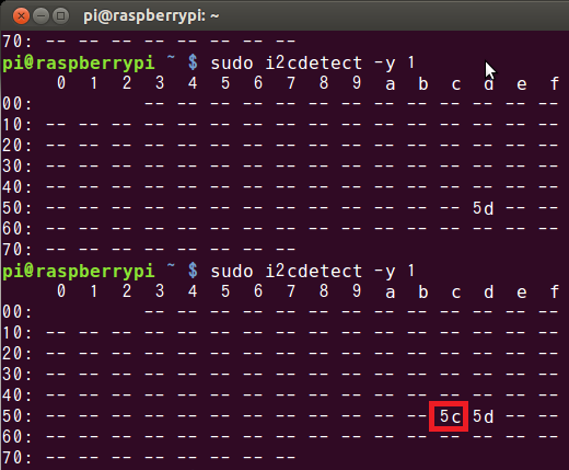 | I2C.h I2C.cpp に以下の関数を追加しました。 int GetFd(){return m_nFd;} int wakeUp(int devAddr, int cnt); int Write(int devAddr, char* pData, int size); int Read(int devAddr, char* pData, int size); 上記計測プログラムは humidity.cpp です。 |