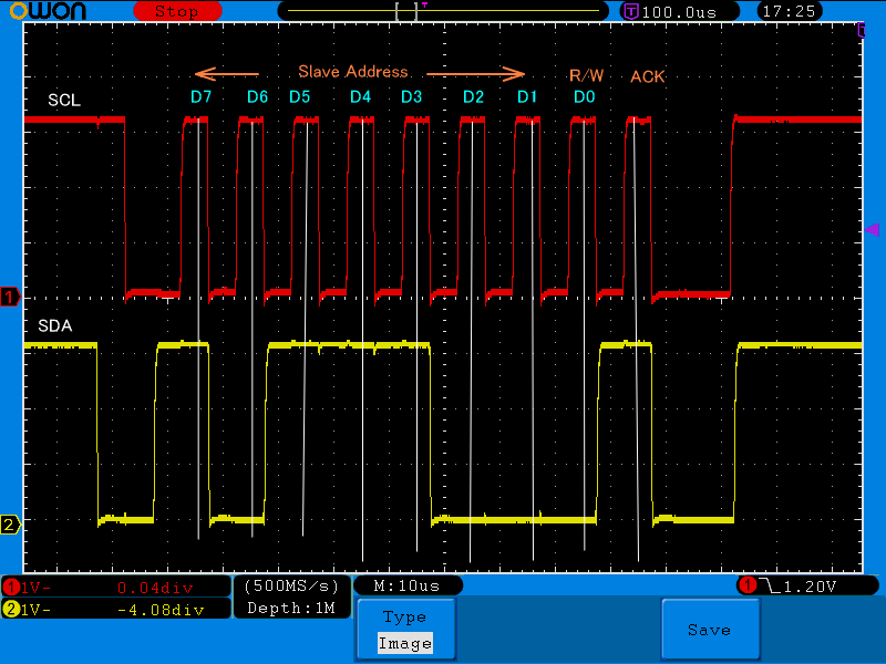 | 湿度センサー 秋月電子通商 温湿度センサ モジュール AM2321 を購入しました。資料が中国語だけです。あまり情報が公開されていません。(もしかして、あまり売れていない?) スレーブアドレスは0xb8となっています。 あれーーーー、i2cdetectで検出されるアドレスは7ビット。0xb8ってどういうこと?あまり深追いをしたくないのですが、調べてみました。 最初に、湿度センサーは本当にI2Cデバイスになっているか? 条件:Power Onから SCL端子をハイ・レベル(3.3V)にして500ms間保持すると SCL端子はPower On からずーーーと3.3Vです。 たぶん、I2Cデバイスになっている。 スリープ状態からどうやって目覚めさせるか? 最初に0xb8を送ると目覚めるらしい?どうやって送るの?結論は、 ioctl (m_nFd, I2C_SLAVE, devAddr) でスレーブアドレスを指定する。 write( m_nFd, NULL, 0); 0バイト書き込む。 エッ!0バイト書き込んだって何もならないでしょう? 当然の疑問です。 本当は、 スレーブアドレスの信号を出す 0バイト書き込む。 となります。 write( m_nFd, NULL, 0); を実行したときのSDA,SCL端子の信号は次のようになりました。 ![]() 信号の意味は。 D7-D1はスレーブアドレスです。 D1を最下位ビットとした信号のアドレスは1011100(0x5c)になります。つまり0xb8を1ビット右シフトした値です。 というこは、i2cdetectで検出できないか? できました。 注意:秋月電子のLCDを外してください sudo i2cdetect -y 1 すぐにもう一度 sudo i2cdetect -y 1 ![]() おおーー!0x5cの湿度センサースレーブアドレスが見えた。 |