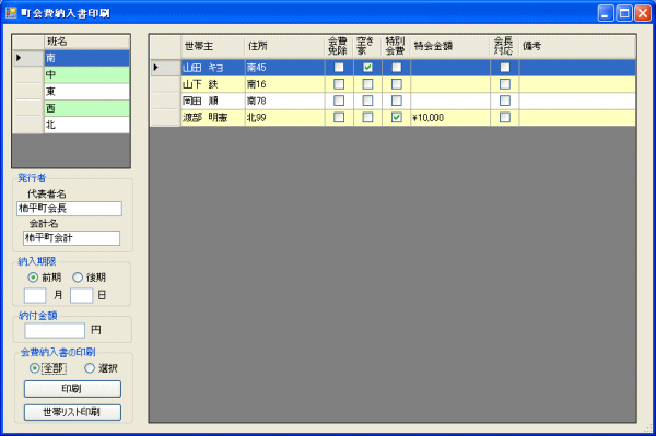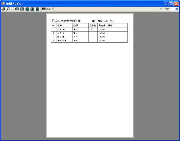 | この機能が不要な方は、読む必要がありません。 機能の理解のため、データの削除、変更、新規追加は行わないでください。 町会費納入印刷は以下のボタンの操作が必要です。 ![]() B5用紙に以下のような町会費納入書が印刷されます。、 ![]() 設定と上記町会費納入書との関連は形式で記載します。 設定:町会費納入書記述内容 1.会計年度:平成22年度 2.班:南 3.世帯:山田 キヨ 4.役職(会長)、役員(会長で登録された役員名):亀田 兼 5.役職(会計)、役員(会計で登録された役員名):須永 定治 印刷は[町会費納入書印刷]ボタンをクリックします。 ![]() 前期。後期の選択をしてください。 前期後期は柿平町会の納入規約に準拠しています。 前期:全世帯から町会費をいただきます。(ただし、例外を除く) 後期:空き家になっている世帯は町会費をいただきません。 このような規約がない町会では、前期を選んでください。 納付金額を入力します。 Ver1.1以前では町会名が柿平町で固定でした。 Ver1.2から任意の名前に変更できます。 柿平町以外の町会では、 柿平町会長 柿平町会計 を任意の名前で置き換えてください。 入力したデータは保存されません。この画面を開くたびに柿平町になっています。面倒くさいですが、大菜会計が柿平町から生まれたソフトということで記念としておきます。 全世帯に印刷する場合、 班を選びます。 班の世帯が表示されます。 全部のラジオボタンにチェックをいれます。 印刷 ボタンをクリックします。 プレビューが表示されます。 ![]() 正しいか確認して、プレビューの印刷ボタンをクリックします。 最後にプレビューを閉じる。 上記の操作を班ごとに繰り返してください。 参考: 切り取り線をいれるのは、ホームセンターなどで切り取り線用のカッターがを売っています。これを使えば、楽に切り取り線が入れられます。 汚れや紛失で個別の世帯のみを出したい場合、 班を選択します。 個別に出したい世帯を選択します。 選択 ラジオボタンをチェックします。 後は前述の操作と同じです。 班ごとの世帯リストを印刷する。 世帯リスト印刷 ボタンをクリックします。 世帯リスト印刷のプレビューが表示されます。 ![]() 正しいか確認して、プレビューの印刷ボタンをクリックします。 最後にプレビューを閉じる。 上記の操作を班ごとに繰り返してください |
