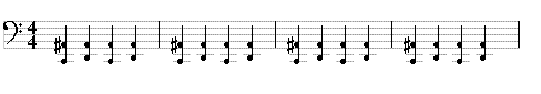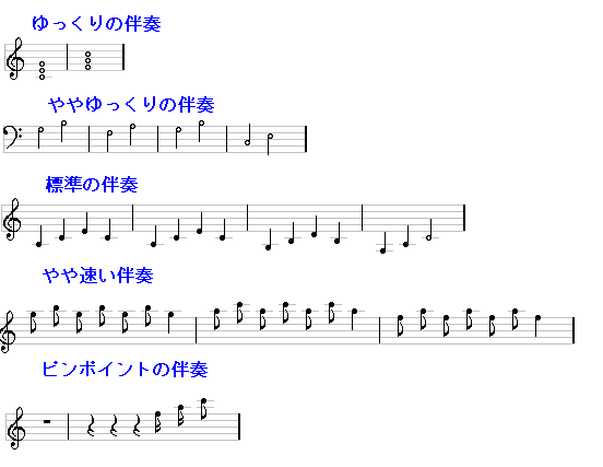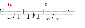 | 出来上がったメロディーにいろいろな楽器を使って伴奏をつけます。各小節に対する和音が決まりました。この和音さえ決まっていれば、それほど悩まず伴奏をつけることができます。(本当は楽器数が多くなると悩むのですが...)とりあえず伴奏として、 1.打楽器があったらいい 2.低音を響かせるためにベースがあったらいい 3.曲の進行に応じて適切な伴奏があればいい(抽象的で試行錯誤します) こんな感じで伴奏をつくります。 1.打楽器 控えめな伴奏とします。楽器としてはAcostic Snare, Bass Drum 1, Open High Hatこれだけでやってしまいます。MIDIでは打楽器は鍵盤に対して楽器が割り当てられています。これらを使った伴奏を以下に示します。 ![]() 譜面でみると単調になります。コピーと貼り付けを使えば編集が楽になります。 2.ベース ベースはゆっくりとリズムを刻む、というのが基本です。たとえば以下のようにするとそれらしくなります。 ![]() Amの和音(ラドミ)ならラとド、Gな和音(ソシレ)ならソとシを使う方法でベースの伴奏ができます。 3.適切な伴奏 サビのところでは、楽器を多く使ってにぎやかにします。ゆったりした伴奏と、忙しい伴奏を楽器により使い分けます。 ![]() こんな感じになります。詳しくは「着信拒否の女」のデータを参照してください。 |