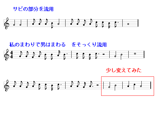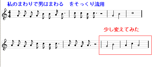 | 歌詞にメロディーが付き、伴奏もつきました。これで終わり。でもいいのですが、曲の出だし、1番と2番の間、そして最後にお化粧をすれば曲が豪華になります。これらをつくります。 作り方としては、 1.専用につくる 2.すでにできているメロディーを流用する がありあます。 専用に作るは結構大変です。特に演歌などではオーケストラみたいな派手なものがあります。また、歌詞部分へのつなぎを考えると、前奏と歌詞部分のミスマッチなどもあります。そこで、無理なく歌詞部分につなげるためにメロディーから流用することにします。 演奏するメロディー部分を考えます。サビの部分でもよいと思いますが、ちょっと控えめにしたかったので、 私のまわりで男は回る をそっくり使うことにしました。 演奏楽器は優雅なイメージでOrchestral Harpを使いました。しかし、これでは短すぎると思い、この部分を少し変えて次のようにしました。 ![]() 次に1番と2番の間です。前奏にサビの部分を加ました。他の楽器の演奏を全部止めて、サビの部分を控えめに繰り返すといった感じです。 ![]() 次に曲の最後です。上記は次に曲が続くようになっています。これを曲が終わるように直します。 ![]() これで完成しました。 説明が大雑把過ぎるなどわかりにくい点があるとは思いますが、それほど難しく考えなくても曲はできるということが実感していただければ幸いです。 |