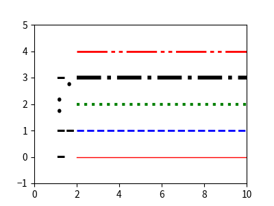 直接破線のパターンで指定することもできます。縦軸4の赤い線です。 ax.plot([2, 10], [4, 4], 'r', dashes=[16,2, 2,2, 2,2],