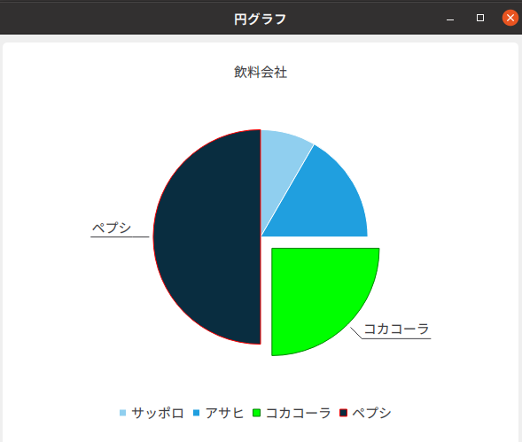 slice.setExploded(True)円グラフから飛び出す。slice.setLabelVisible(True)コカ・コーラと表示です。
