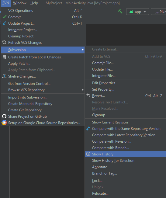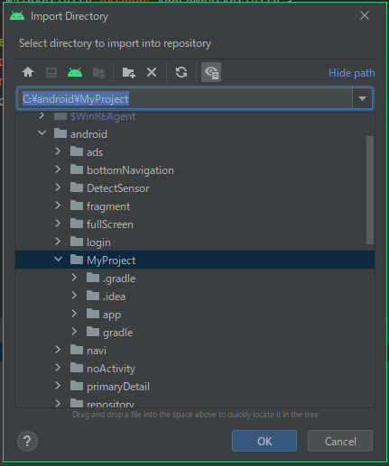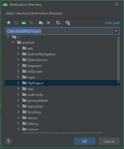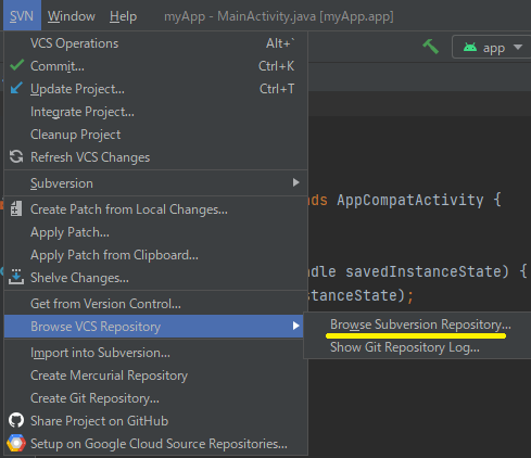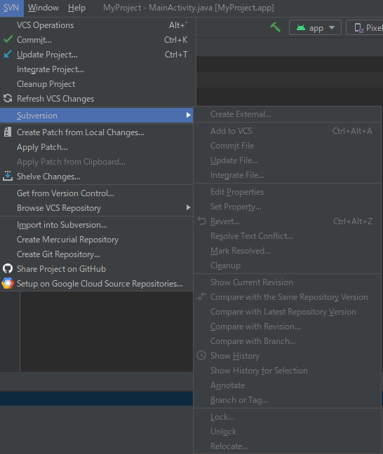 リポジトリとは、データを置いておく場所です。具体的事例をみればよくわかると思います。 前回の解説では、行き当たりばったりのフォルダーで統一感がありませんでした。 そこで今回は次のように定義します。 パソコン名 CF-SX2 アンドロイドの開発をするフォルダー C:\android Subversionで管理するリポジトリのフォルダー C:\android_repos 対象とするプロジェクト名 MyProject MyProjectの作成 C:\androidに作成してください。 分かりやすくするため何も変更しないで下さい。 .gitignoreの変更 プロジェクトをビルドして実行形式のファイルができますが、Subversionで管理する必要のないファイルが生成されます。これを無視するファイルを定義するのが、 .gitignore です。プロジェクト直下のフォルダーに配置されています。Android Studioの [File]-[Open] でファイルを開いてください。 内容を全部消去してください。 以下をコピペしてください。 # Gradle files .gradle/ build/ # Local configuration file (sdk path, etc) local.properties # Log/OS Files *.log # Android Studio generated files and folders captures/ .externalNativeBuild/ .cxx/ *.apk output.json # IntelliJ *.iml .idea/ misc.xml deploymentTargetDropDown.xml render.experimental.xml # Keystore files *.jks *.keystore # Google Services (e.g. APIs or Firebase) google-services.json # Android Profiling *.hprofこれは、 https://github.com/github/gitignore/blob/main/ で公開されている内容です。 次にリポジトリを作成します。