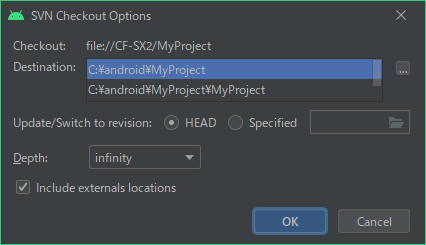 チェックアウトも言語明瞭・意味不明な感じです。最初にSubversionのリポジトリからプロジェクトを取得する操作です。