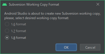 ,フォーマットを選択します。最近始めたので1.8だけで、選択の余地はありません。 [OK]をクリックします。 ![]() プロジェクトを開くか?好きなほうを選んで下さい。 ![]() Subversionのメニューがイネーブルになりました。 |