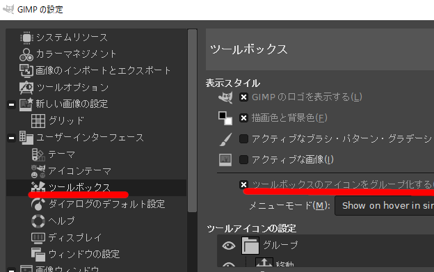 ツールが少ない!よく見るとツールの右下に小さな三角がある。クリックしてみる。他のボタンが現れた。違和感あり。バージョン2.8のようにボタンが全部表示されたほうが操作性がよいので[編集]-[設定]を見ると、