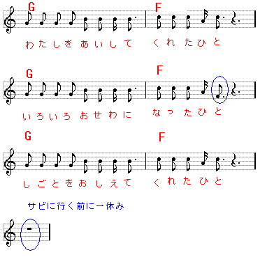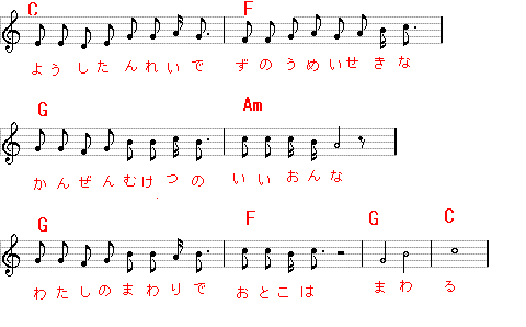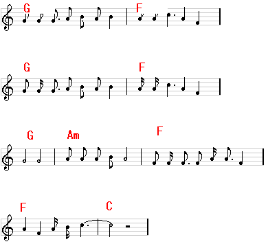 | 出来上がったメロディーに伴奏をつけます。 伴奏をつけるには各小節がどのようなコード(和音)で調和するのかを知る必要があります。 ハ長調の曲なので大雑把にC、F、G、Amのどれかに当てはめて、それを聴いて確認します。確認のため新たに拡張子SRTのソング頼太ファイルを作成します。 [ファイル]-[新規作成] で演奏楽器をSynthSrings 1を選びます。 まだ、何もデータを入力していないファイルですが、 [ファイル]-[名前をつけて保存] で保存します。 次にメロディーのファイルと、伴奏を関連付けるためプロジェクトを新規作成します。 [プロジェクト]-[新規作成] で任意の名前をつけます。次に [プロジェクト]-[編集] で、トラックにメロディーと伴奏のファイルを設定します。 これでメロディーと伴奏のファイルが関連付けされました。 各小節に対応する和音を調べるため、全音符で和音を入力して聴いてみます。 [演奏]-[全トラック]をオンにすればメロディーと伴奏を同時に聴くことができます。伴奏をつけるときに大変便利です。各小節に対応した和音は次のようになりました。 ![]() ![]() ![]() 以上でメロディーに和音が割り振られましたので、後はいろいろな楽器を使ってお化粧(?)の伴奏を更に付加します。 |