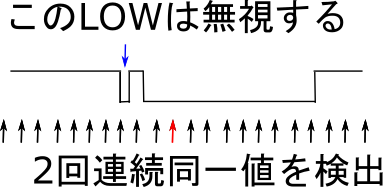 青の矢印がチャタリングが発生したところです。 チャタリングガードの方法は、タイマー割り込みでスイッチを監視して2回連続でLOWを検出したらスイッチが押されたと判定します。