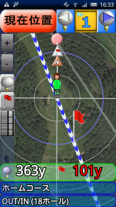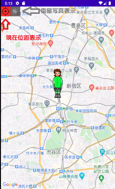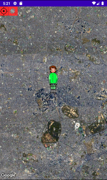 が赤くなっていると現在位置表示モードです。現在位置にマーカー(女の子)が表示されています。このボタンをタップすると赤から灰色にかわりマーカーが消えます。このモードではスワイプして地図が現在位置に戻ることはありません。