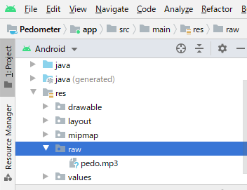 リソースにrawフォルダを作成し、そこにpeedo.mp3を貼り付けます。それなりに仕上がっていますので、興味ある方はこれをベースに応用を作ってみてください。
