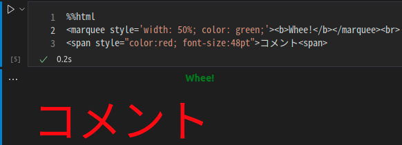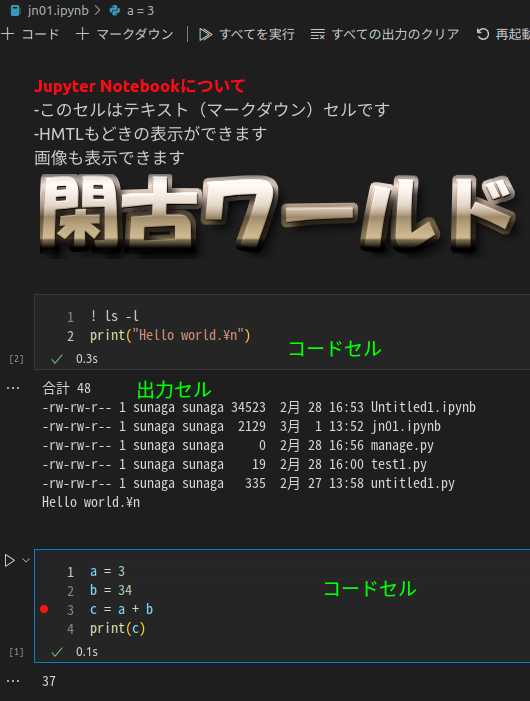 部分で構成されます。 upyter Notebookではコードセルとテキストセル(VS Code ではマークダウンセル)を使ってプログラムを記述します。 例で見たほうが手っ取り早いです。 ![]() 一番上はマークダウンセルです。通常のテキストエディタでは文字の大きさや色などは 変更できません。しかし、Jupyter Notebookでは文字の大きさや色の変更や更に画像の 挿入もできてしまいます。マークダウンによるHTML的な表現が可能です。 次にコードセルはPythonでの記述以外に、 ! linuxのコマンド と書けばlinuxのコマンドを実行します。 例: ! ls -l もちろんPythonのコードも実行します。 また、マジックコードを使うと、 ![]() HTMLをフルに記述することができます。 マークダウンには こちらを参照してください。 文字の大きさについては記載がなかったので、 ## ABC #の数で大きさがかわります。 また、マジックコードに こちらを参照してください。 |