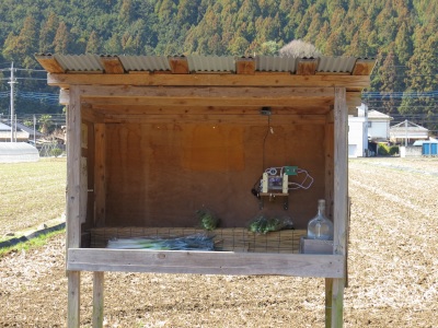 ![]() 農道にポツンと無人直売所です。のどかな田園風景ですが、農家にとっては重大な問題があります。それは展示した商品を金を払わず持っていく者(ドロボー、万引き)がいることです。ドロボーの被害が多い日は商品の半分くらい盗まれるそうです。対抗策として動画ような監視カメラを開発しました。 Raspberry Piをつかって開発しました。 |